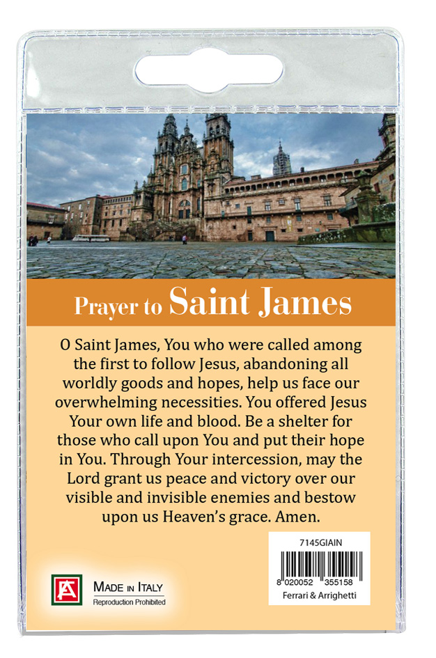 Calamita in metallo nichelato raffigurante San Giacomo il Maggiore con preghiera in italiano.