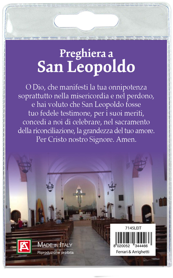 Nell'interno del blister c'è anche un cartoncino con l'immagine di San Leopoldo e sul retro del cartoncino stesso una preghiera a lui dedicata.