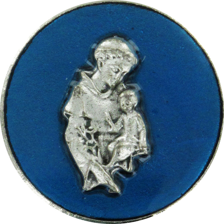 Calamita con forma ottagonale, in metallo nichelato con smalto blu che circonda la placchetta in metallo, raffigurante Sant'Antonio. La misura della calamita è di 4 cm.