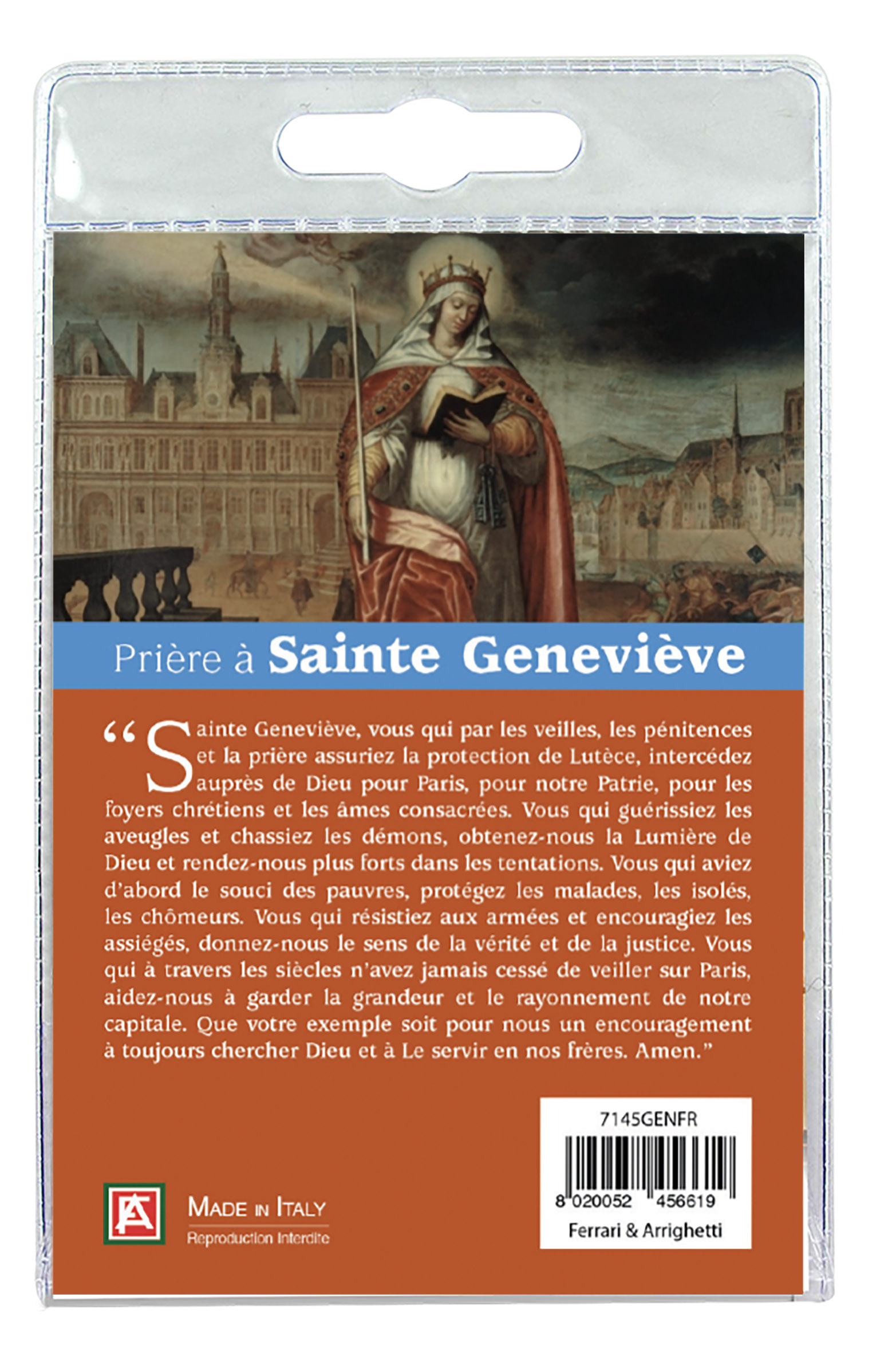 Calamita Santa Genoveffa in metallo nichelato con preghiera in francese