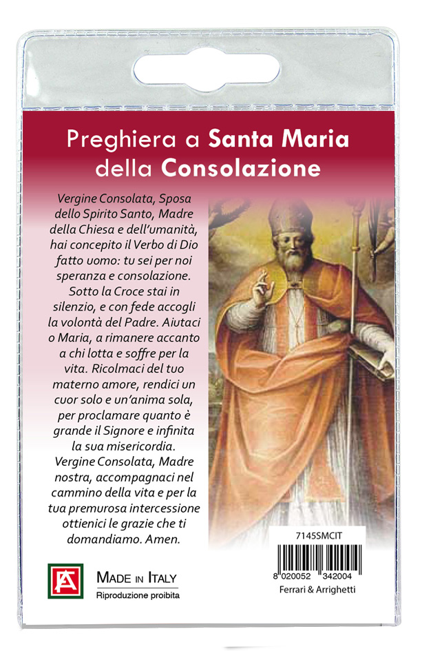 Nell'interno del blister c'è anche un cartoncino con l'immagine di Santa Maria e sul retro del cartoncino stesso una preghiera a lei dedicata.