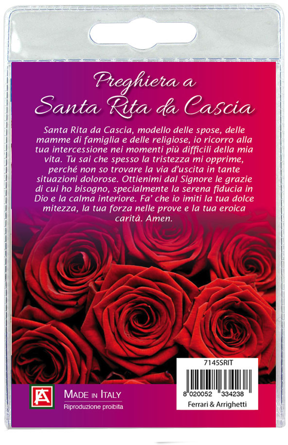 Nell'interno del blister c'è anche un cartoncino con l'immagine della Santa e sul retro del cartoncino stesso una preghiera a lei dedicata.