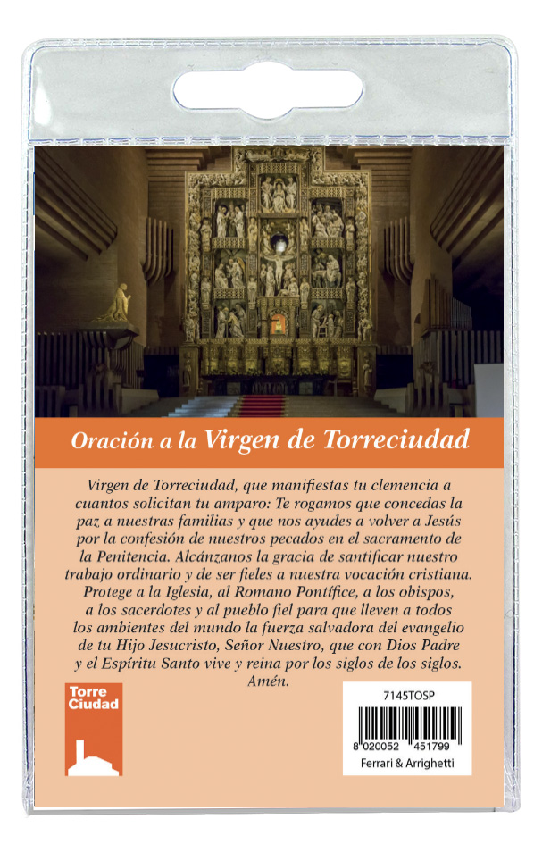 Calamita in metallo nichelato raffigurante il Santuario de Torreciudad con una preghiera in spagnolo.