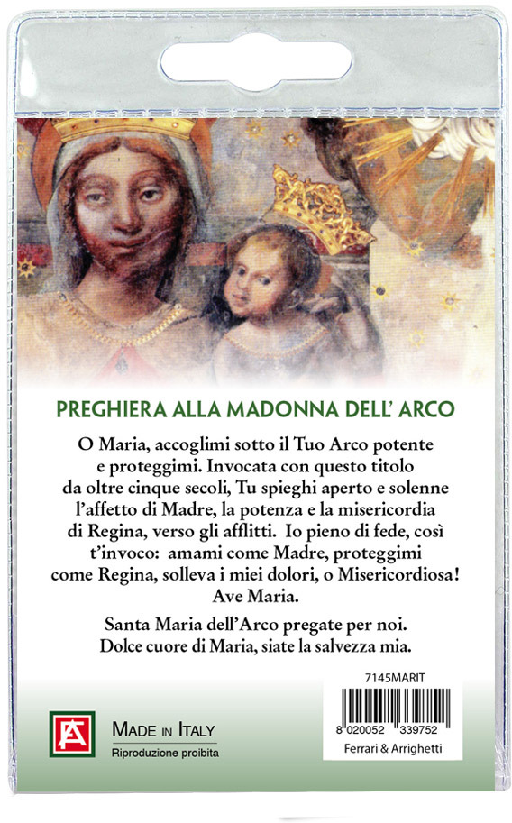 Nell'interno del blister c'è anche un cartoncino con l'immagine del Santuario e sul retro del cartoncino stesso una preghiera dedicata alla Madonna dell'Arco.