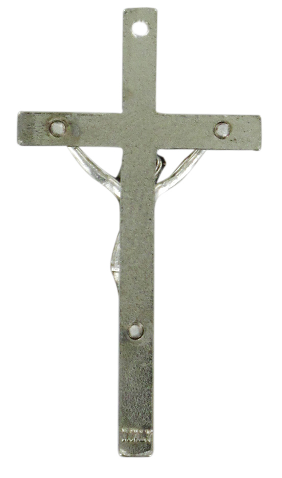 Croce in metallo nichelato con Cristo riportato di misura 5 x 2,5 cm.