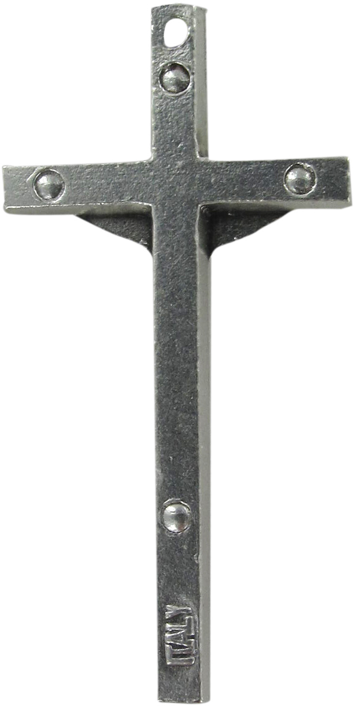 Croce in metallo nichelato con Cristo riportato di misura 3 x 1,5 cm.