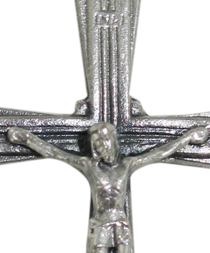 Croce con Cristo riportato in metallo argentato. Misura della croce: 4,5 cm.