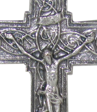 Croce da tavolo in metallo argentato con base in legno. Altezza della croce: 5 cm.