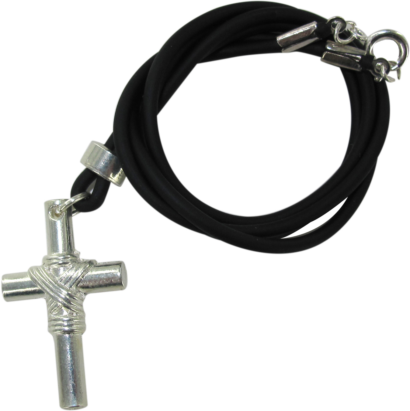 Croce in metallo argentato con cordoncino in caucciu nero. La croce misura 3 cm d'altezza, mentre il cordoncino misura 50 cm.