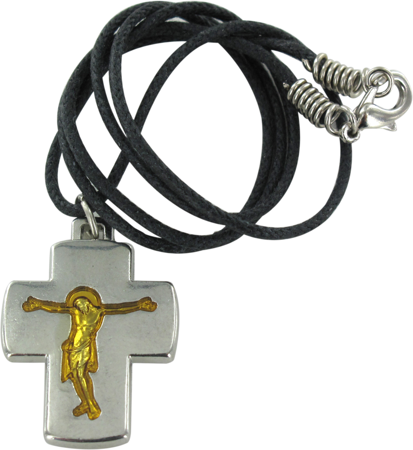 Croce in metallo argentato con l'incisione dorata di Cristo di misura 2,5 x 2 cm.