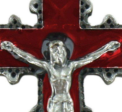 La croce si presenta in metallo nichelato con anellino e smalto rosso bordeaux.