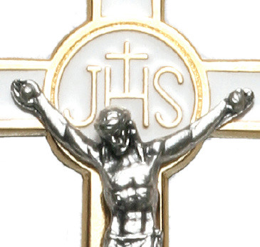 Croce in metallo dorato con smalto bianco e Cristo argentato - 7,5 cm