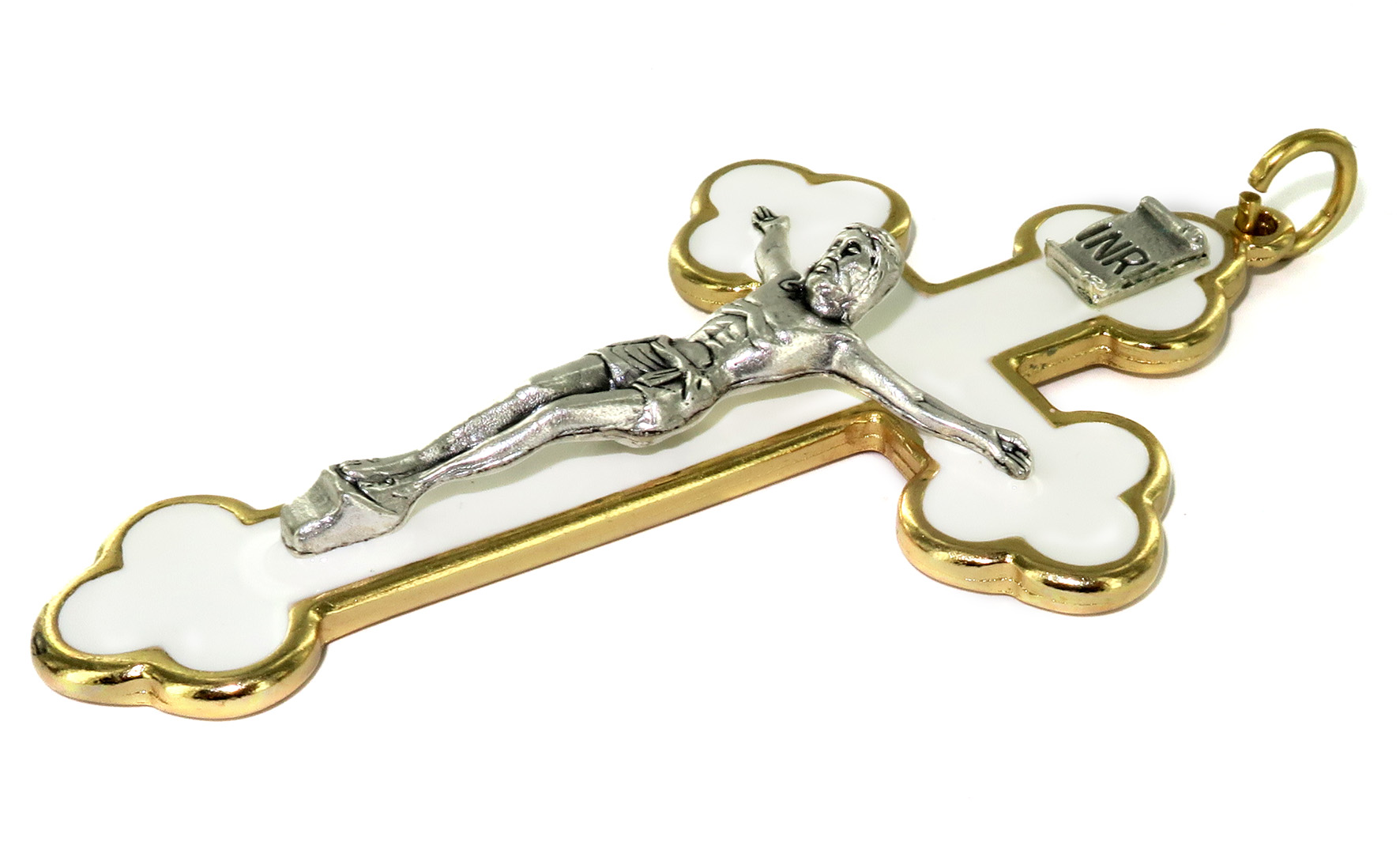 Croce in metallo dorato con smalto bianco e Cristo riportato con bordi a fiore.