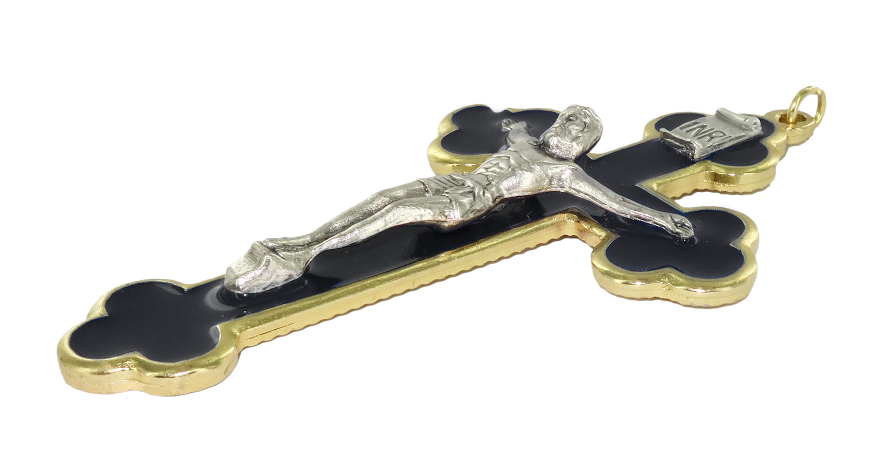 Croce in metallo dorato con smalto nero e Cristo riportato con bordi a fiore.