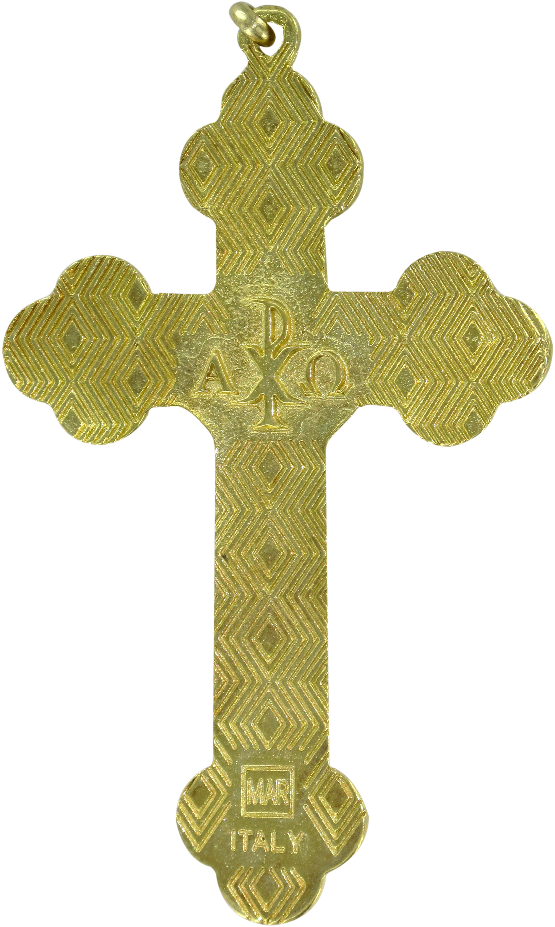 Croce in metallo dorato con smalto rosso e Cristo riportato con bordi a fiore.