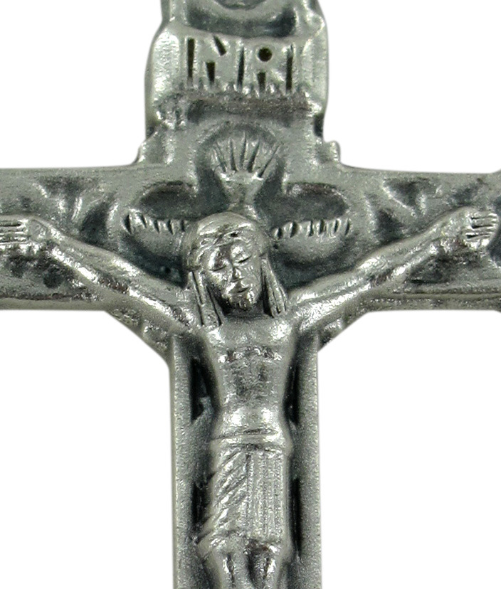Croce in metallo ossidato con il corpo di Cristo riportato. Altezza pari a 6 cm.