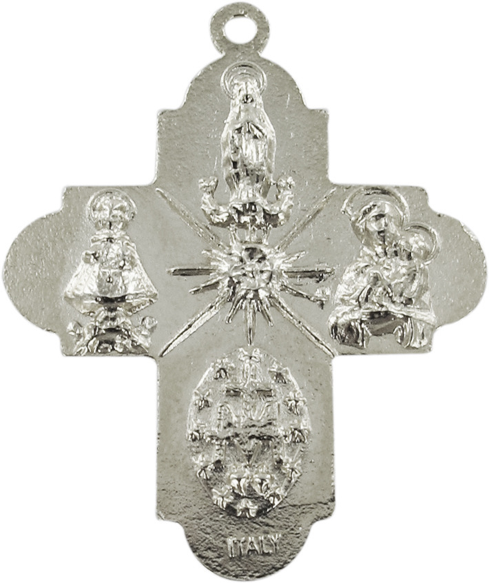 Croce in metallo ossidato raffigurante in entrambe le facce la Madonna Miracolosa, Sacro Cuore di Gesù, San Cristoforo, San Giuseppe con al centro la Cololmba, simbolo di pace e cristianità.