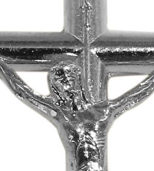 Croce tondino con Cristo riportato in metallo nichelato di misura 3,5 x 2 cm.
