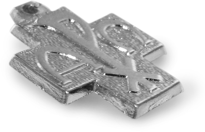 STOCK: Croce Alfa Omega in metallo ossidato da 2 cm.