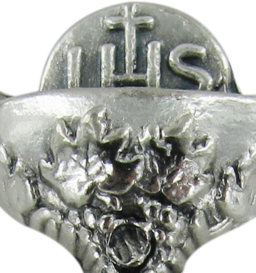 Crocera ovale per rosario realizzata in metallo ossidato, e sulla quale è raffigurato il simbolo della Comunione: il calice (soggetto 6). Realizzato in Italia.