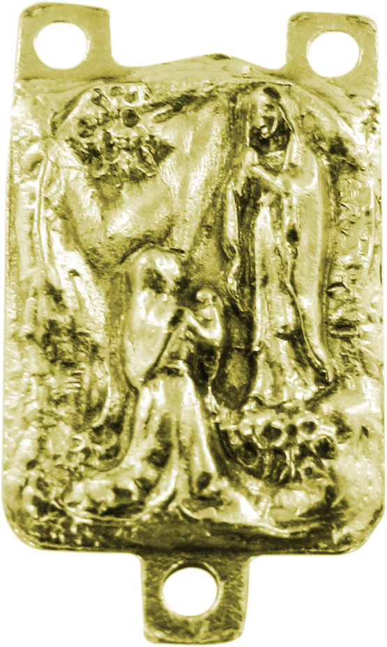 Crocera rettangolare per rosario realizzata in metallo dorato, con l'immagine della Madonna di Lourdes. Realizzato in Italia.