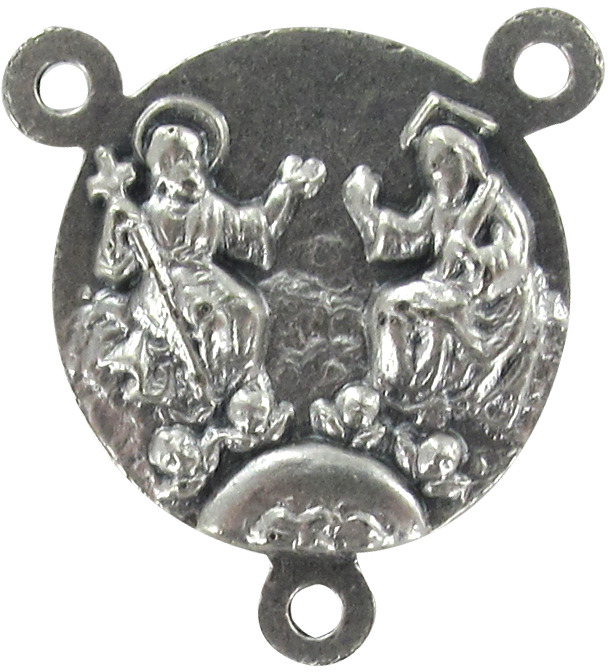 Crocera tonda per rosario realizzata in metallo ossidato, e sulla quale è raffigurato il simbolo dello Spirito Santo da un lato, e una colomba dall'altro. Realizzato in Italia.