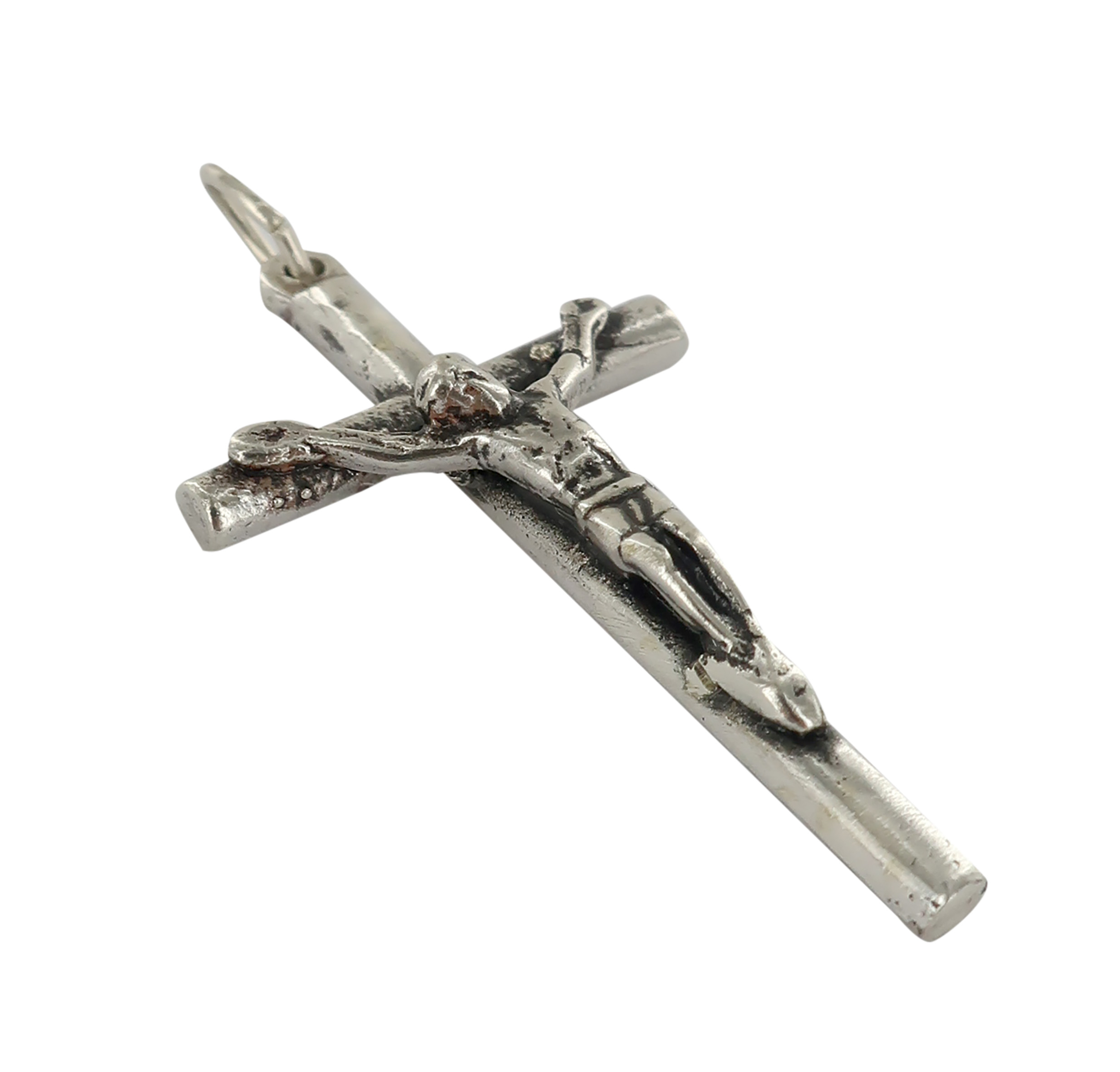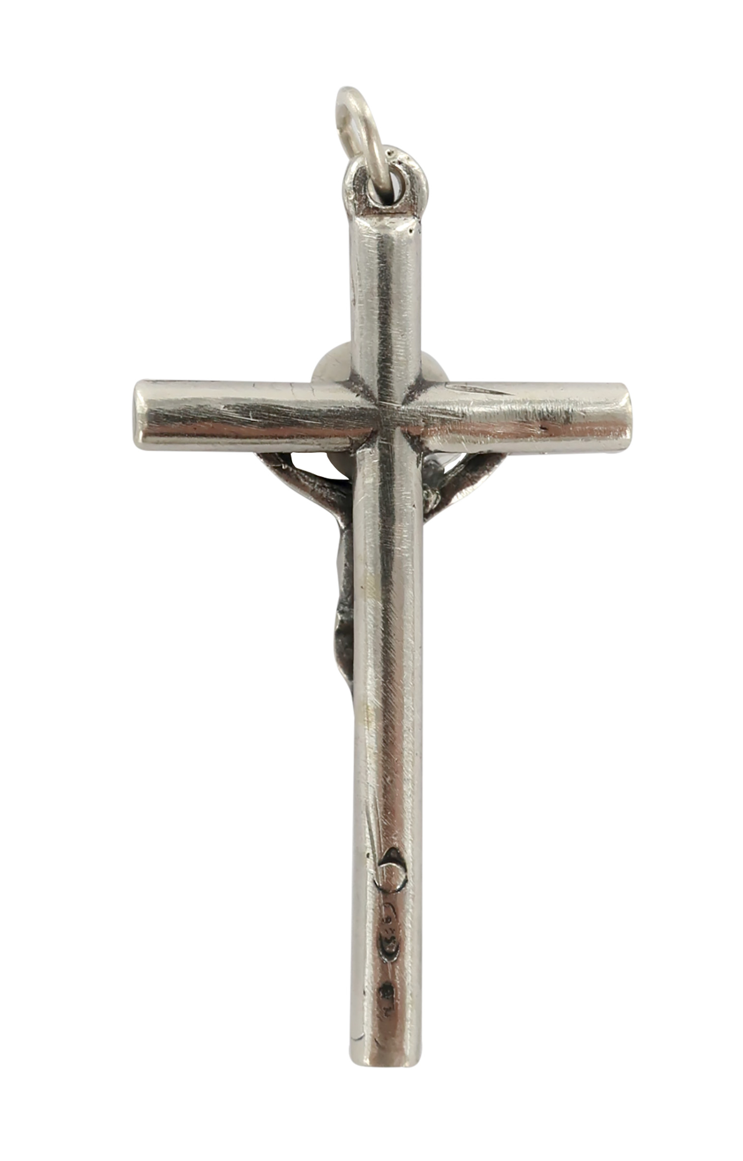 Croce a bastoncino tondo con il Cristo riportato in argento 925.