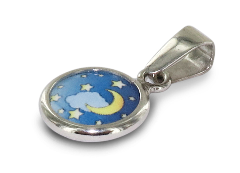 La medaglietta di cm 1 rappresenta la luna con le stelle stampata su porcellana con sfondo di colore blù e incastonato in un profilo di argento lucido.