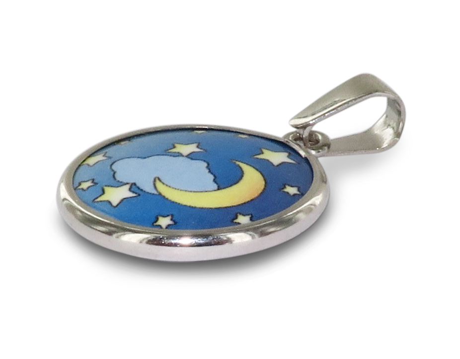 La medaglietta di cm 1,8 rappresenta la luna e le stelle stampate su porcellana con sfondo di colore blù e incastonato in un profilo di argento lucido.