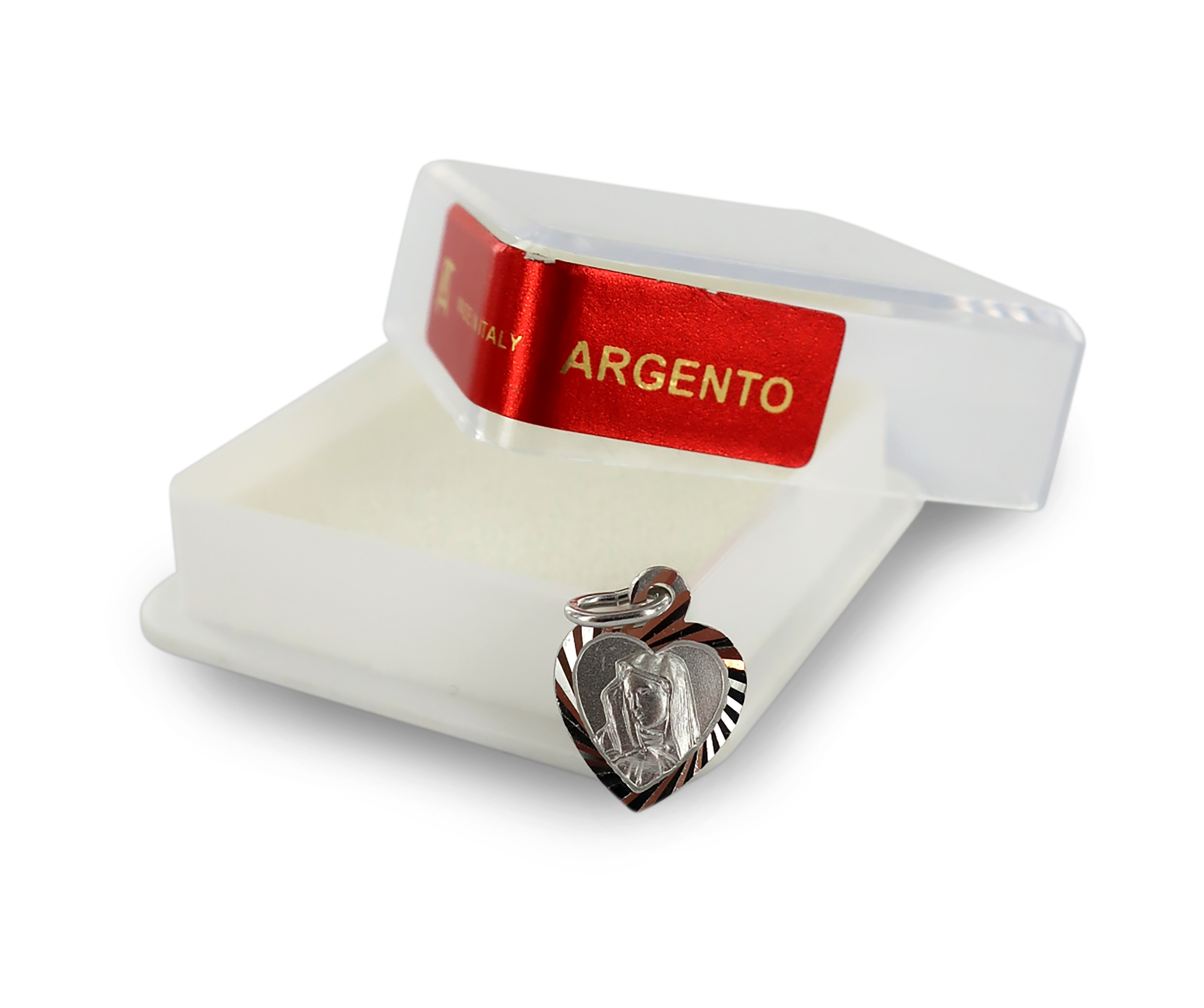 Ciondolo in argento 925 a forma di cuore con profilo zigrinato raffigurante il volto della Madonna Addolorata.
