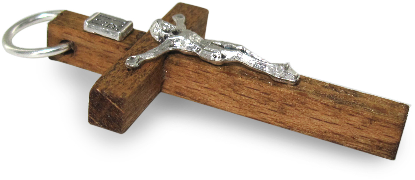 Croce in legno color legno naturale con Cristo in metallo argentato.