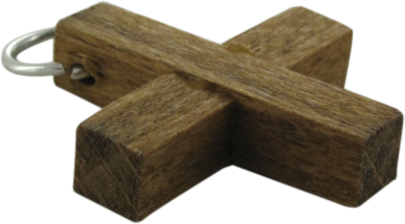 Croce in legno naturale di misura 2,5 x 2,5 cm dotata di pratico anellino.