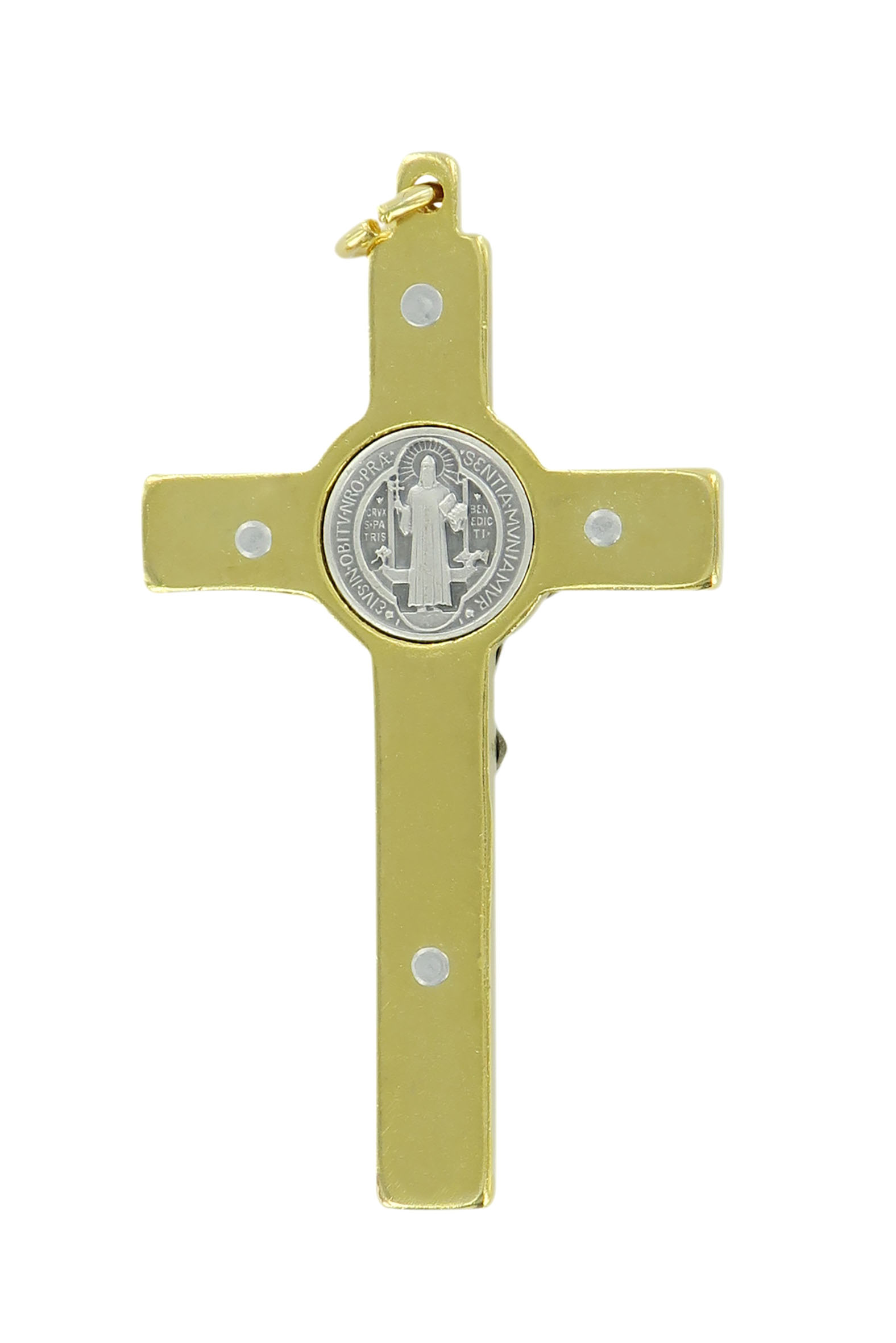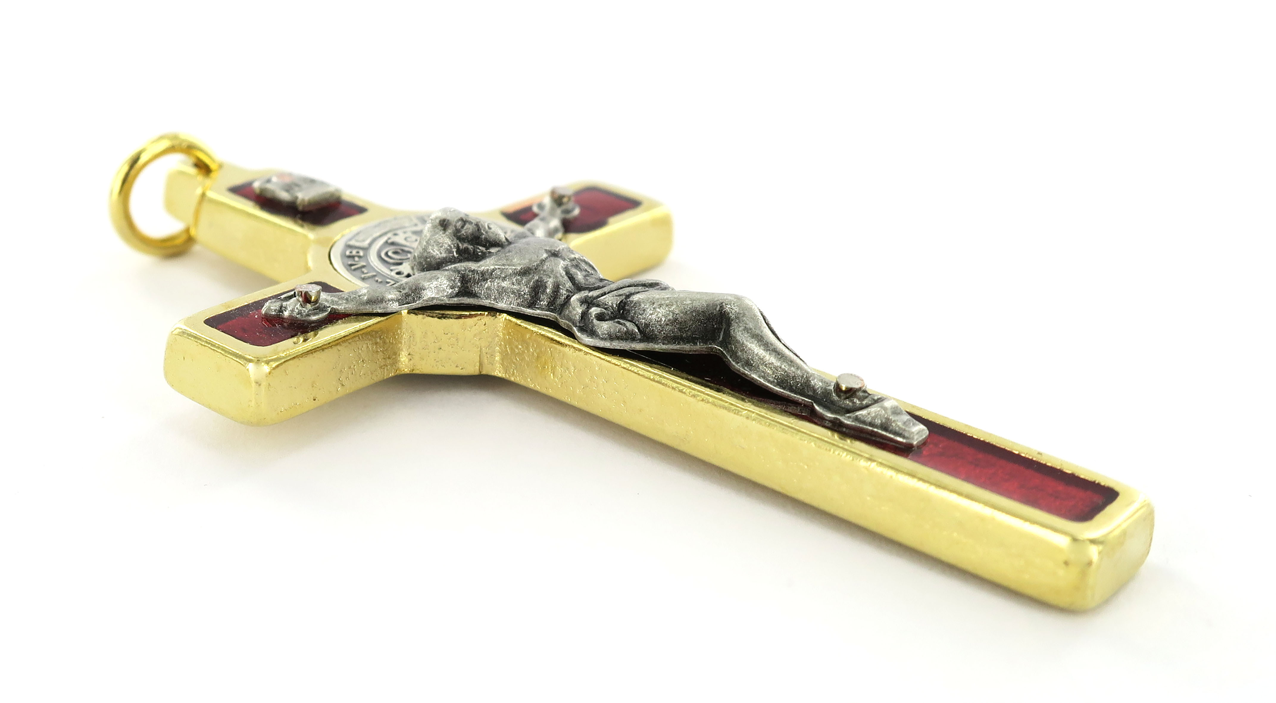 Croce di San Benedetto in ottone dorato lucido con sfondo in smalto rosso e con il corpo di Cristo in metallo argentato.