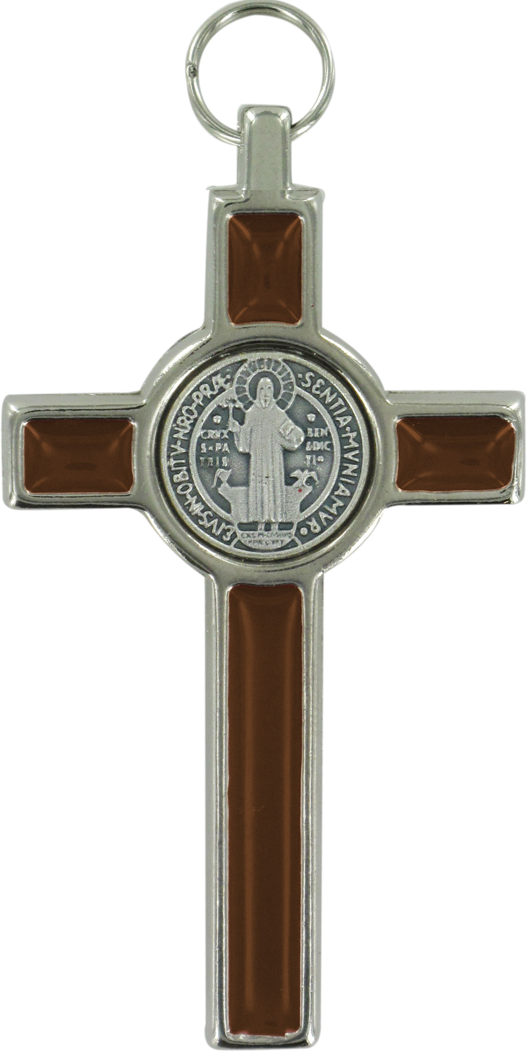 Croce di San Benedetto in metallo nichelato con sfondo in smalto marrone. Altezza della croce: 8 cm. Realizzato in metallo nichelato. La croce è dotata di un pratico foro per mettere il cordoncino/ catena, oppure per essere appesa al muro.