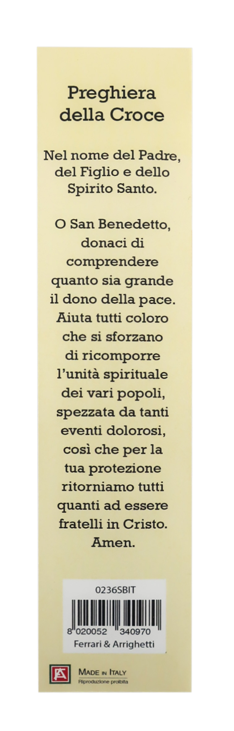 E' confezionata in un cartoncino con l'immagine di San Benedetto, sul retro vi è una preghiera dedicata a lui, il tutto infilato in una busta trasparente.