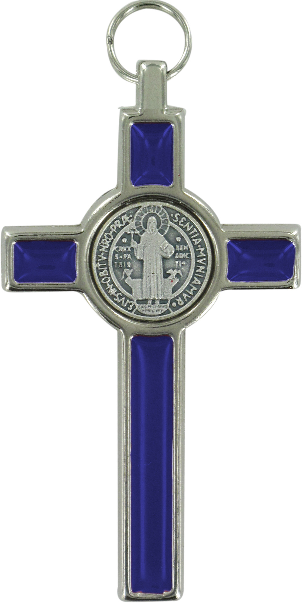 Croce San Benedetto in metallo nichelato con smalto blu - 8 cm