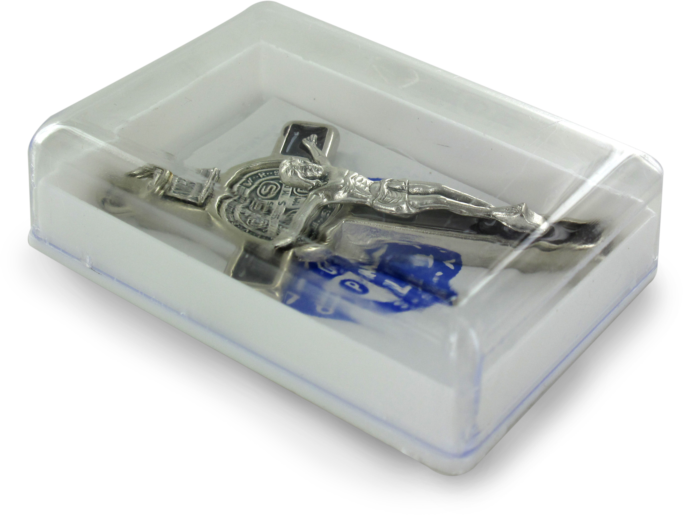 Croce di San Benedetto in metallo nichelato con sfondo in smalto blu.