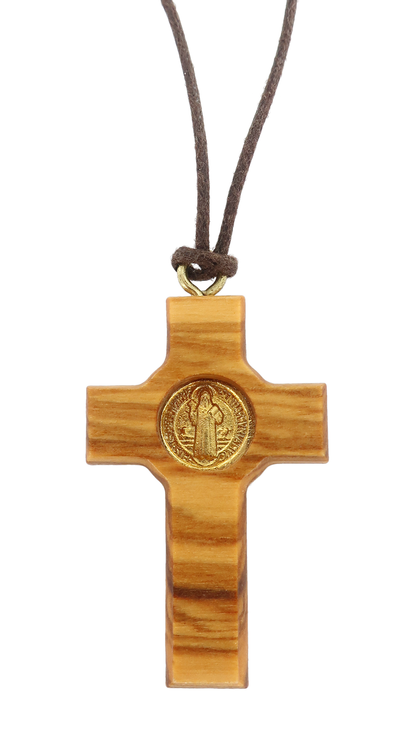 Croce San Benedetto in ulivo e metallo dorato con laccio