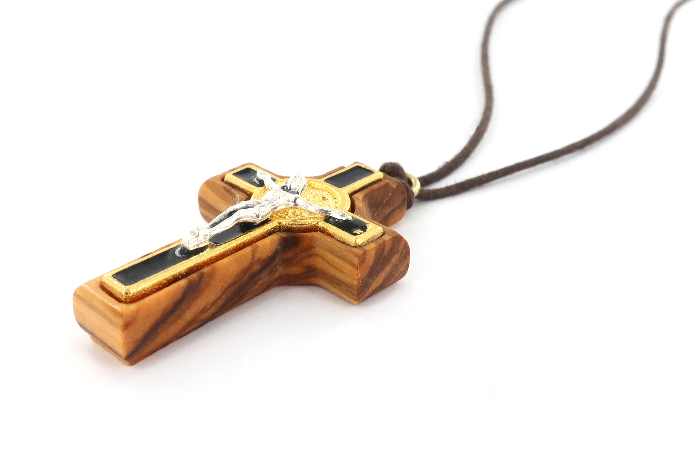 Croce San Benedetto in ulivo e metallo smaltato con laccio