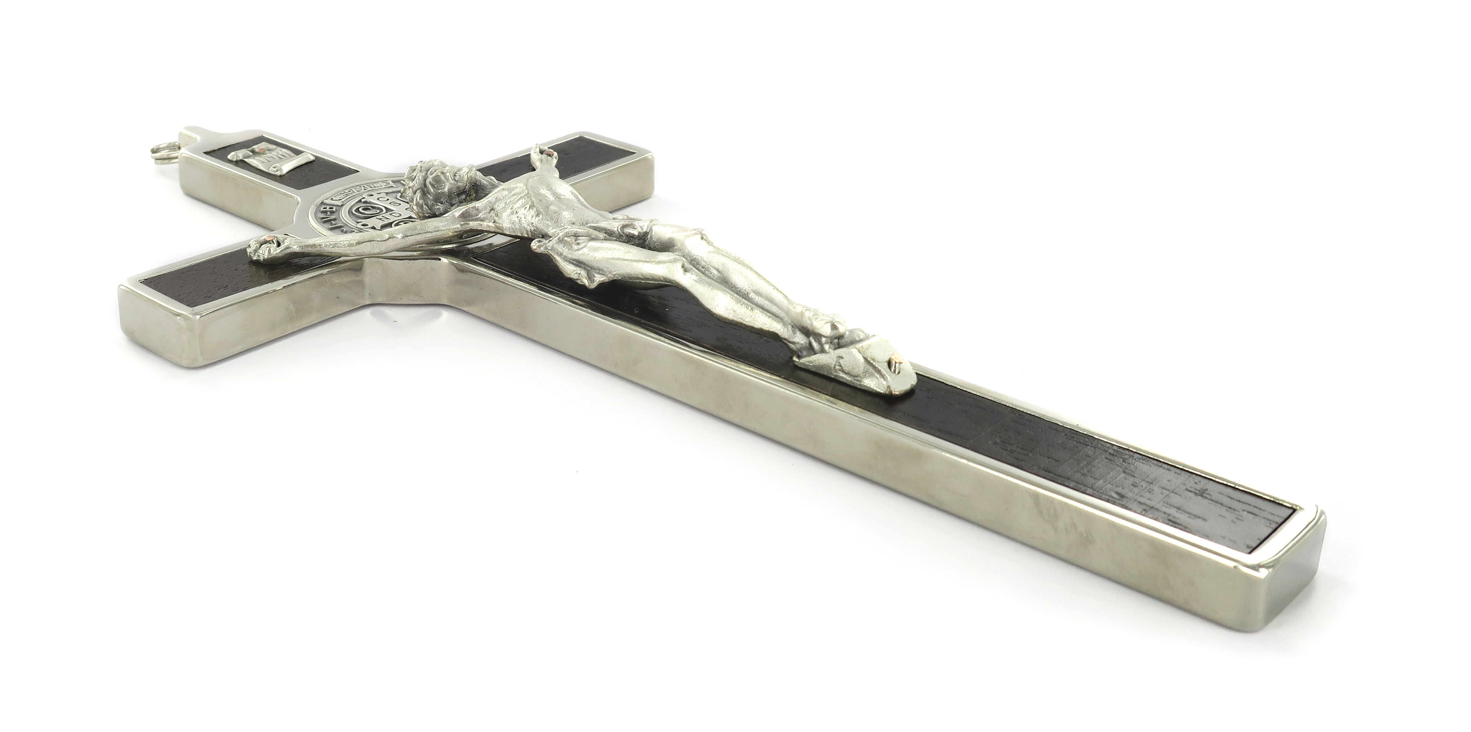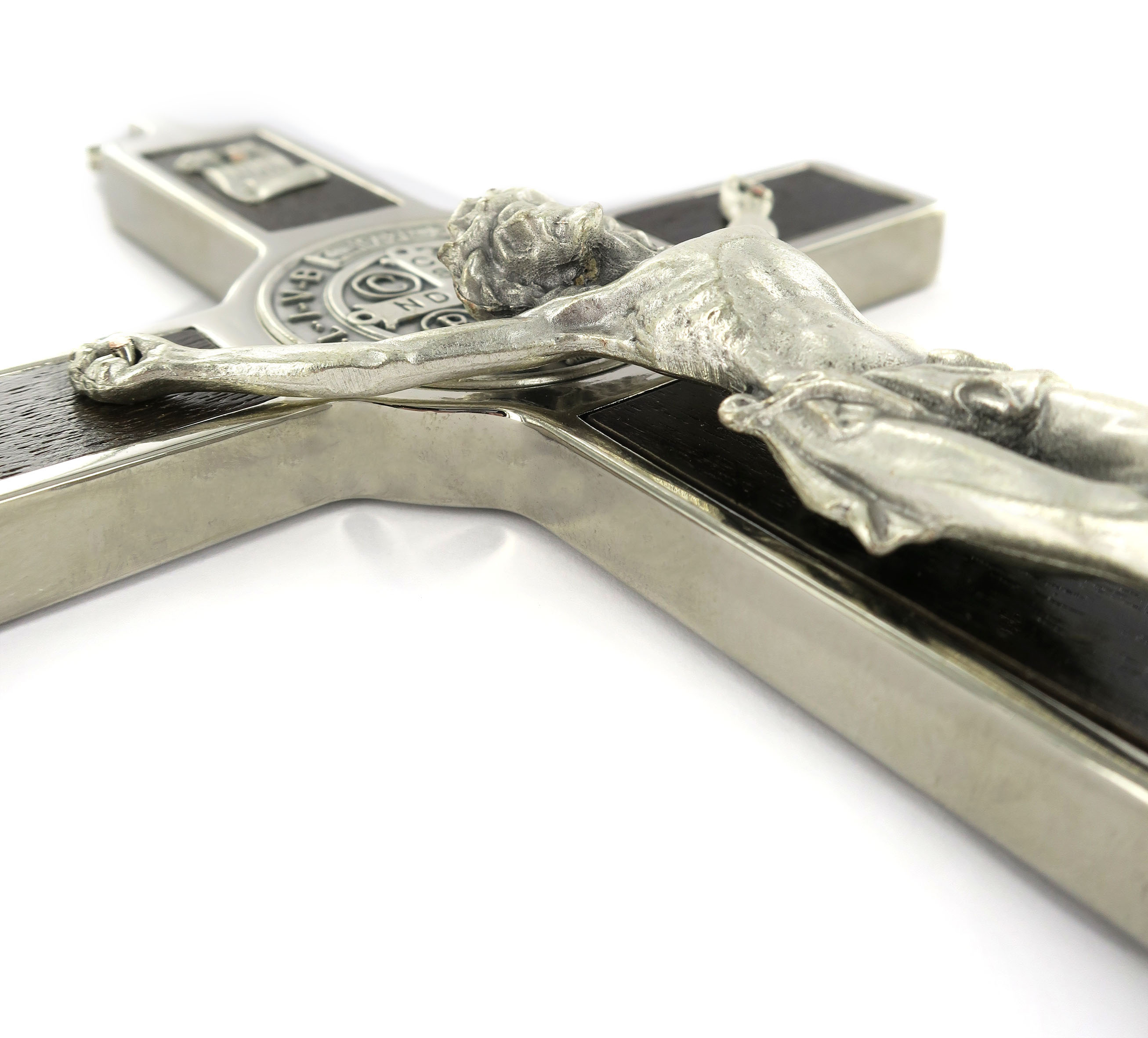 Crocifisso di San Benedetto, con medaglia e corpo di Cristo, realizzato in legno e metallo argentato.