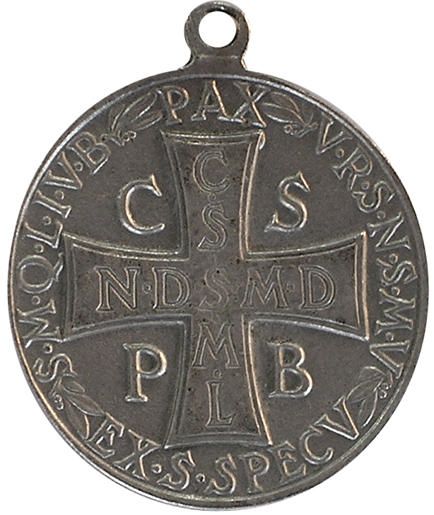 Medaglia raffigurante San Benedetto in metallo argentato ossidato. Altezza: 3 cm.