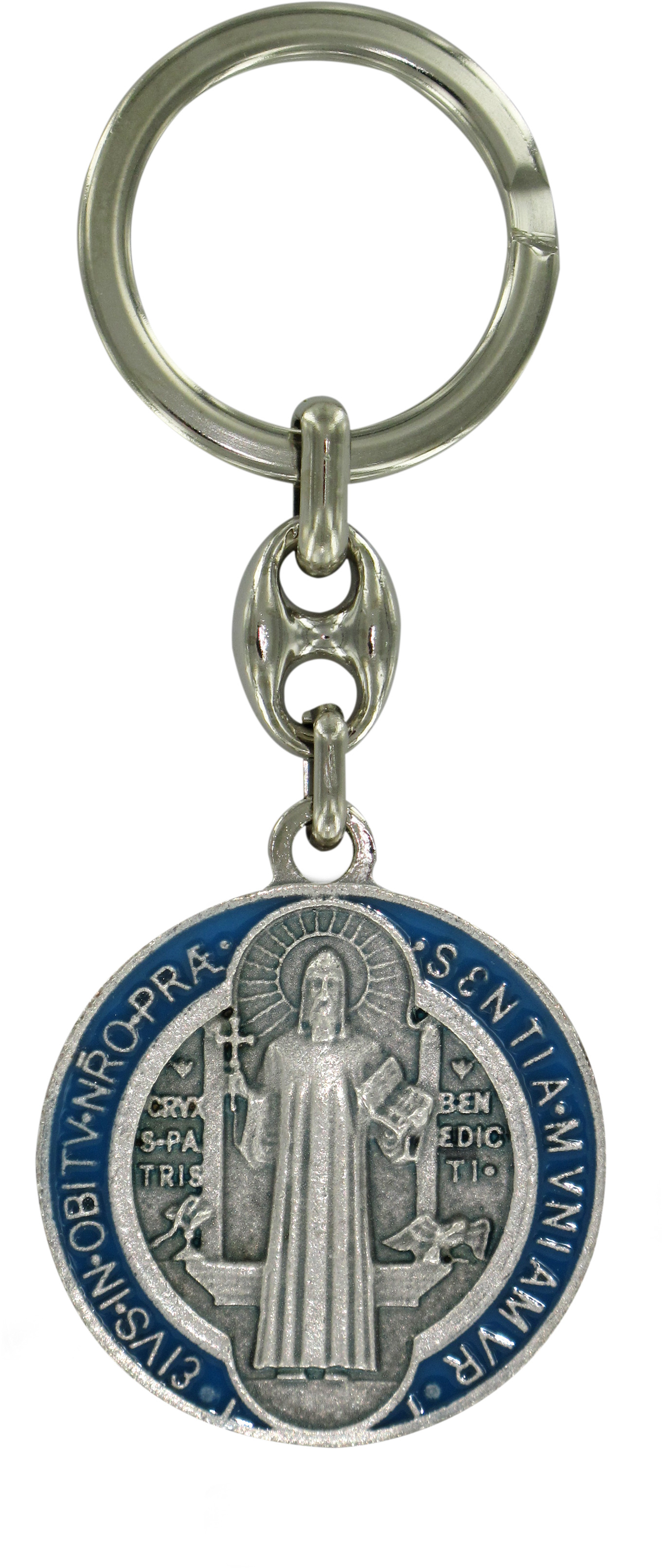 Portachiavi tondo a doppia faccia, raffigurante la Croce di San Benedetto su un lato e il santo sull'altro. Realizzato in metallo con smalto. La medaglia del portachiavi misura 3 cm. (diametro). Realizzato in Italia.