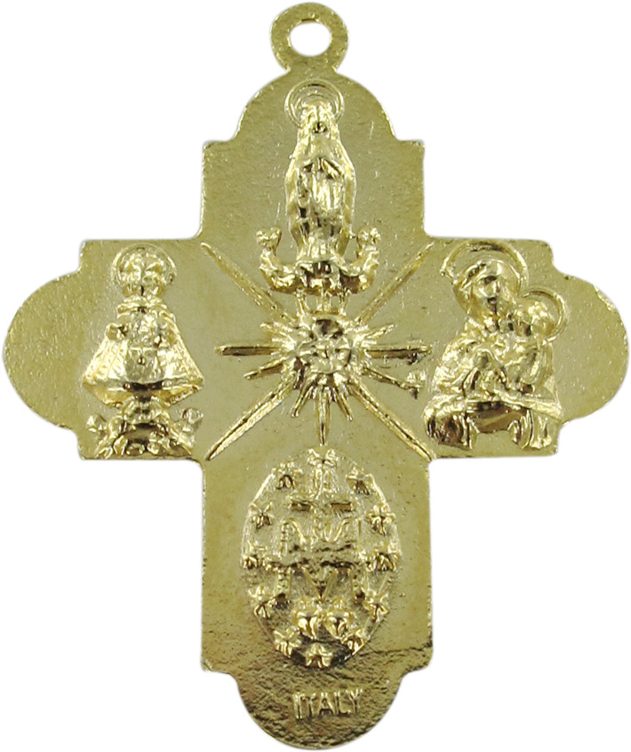 Croce in metallo dorato raffigurante in entrambe le facce la Madonna Miracolosa, Sacro Cuore di Gesù,