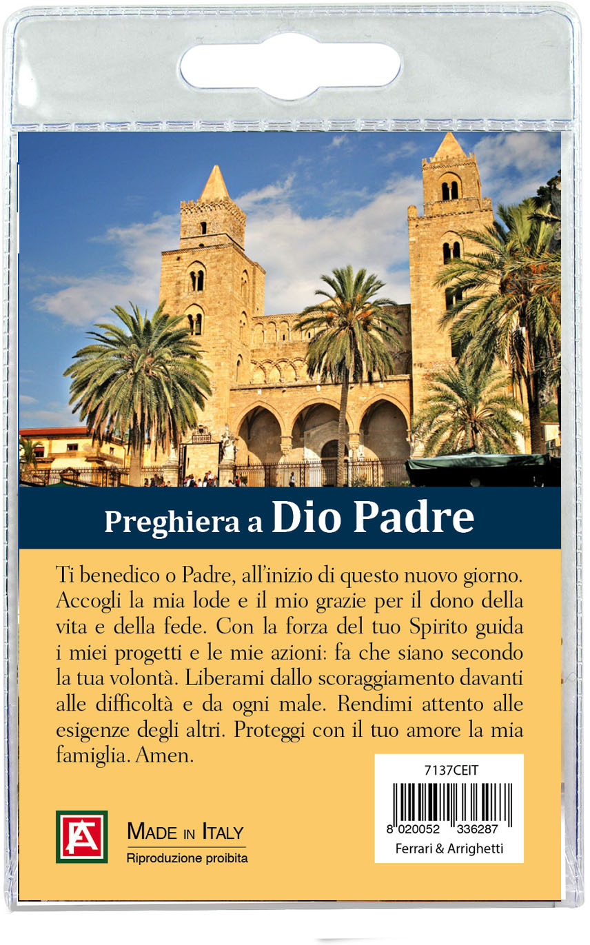 Medaglia del Cristo Pantocratore di cm 2,5 in metallo nichelato con laccio. L'immagine di Cristo è ricoperta da uno strato di resina trasparente. La medaglia si presenta confezionata in un blister con all'interno un cartoncino con immagine del Duomo di Cefalù (Sicilia) e con una preghiera in italiano sul retro del cartoncino stesso.