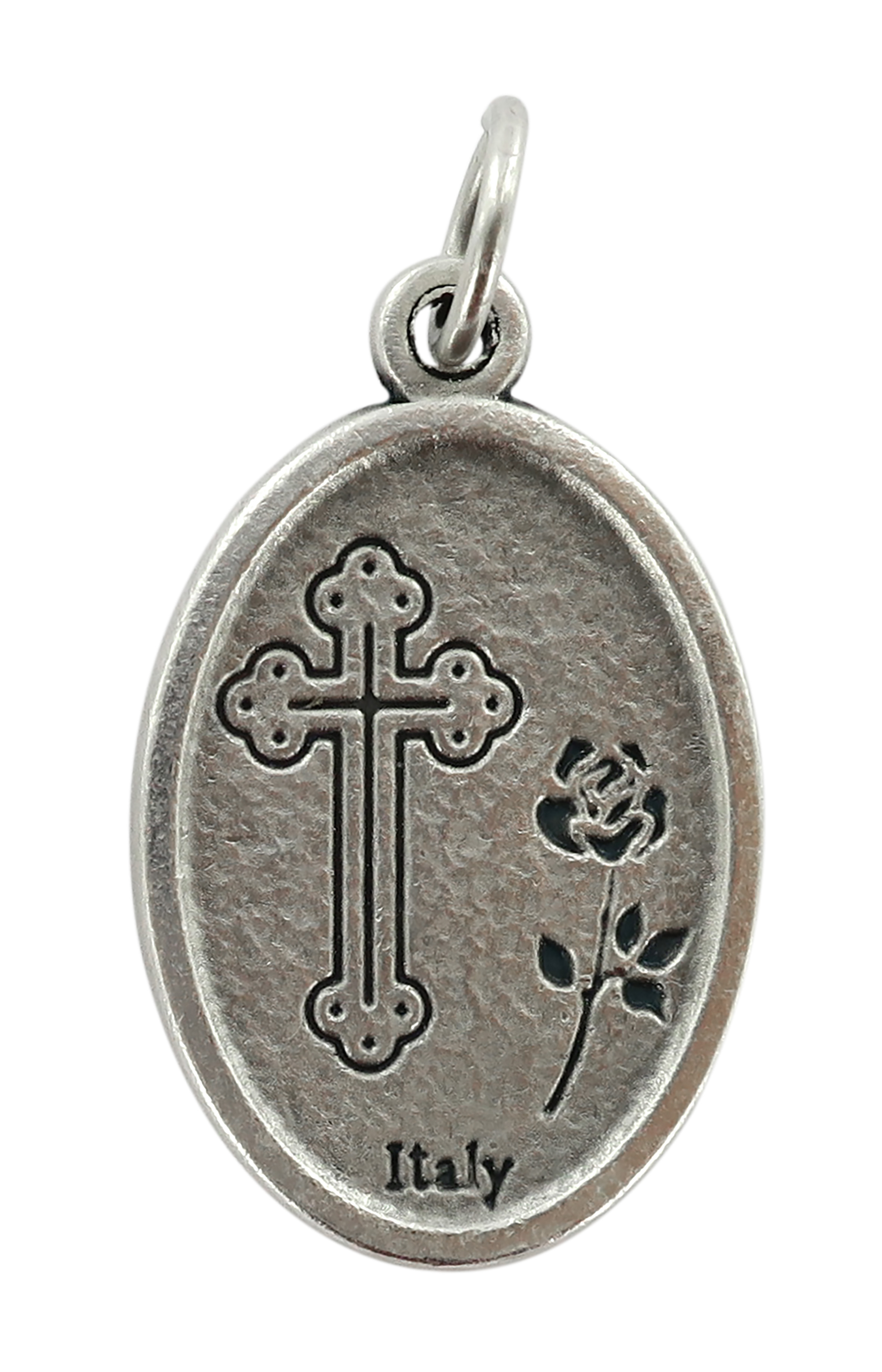 Medaglia ovale in metallo ossidato raffigurante su una faccia Sant'Antonio e sull'altra faccia delle rose di misura 2,5 x 1,5 cm. Il prodotto è realizzato in Italia.