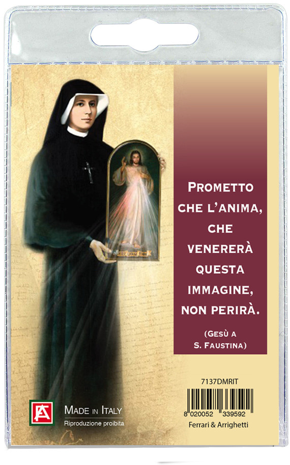 Medaglia Gesù Misericordioso (Roma) di cm 2,5 in metallo nichelato con laccio. L'immagine della Divina Misericordia è ricoperta da uno strato di resina trasparente. La medaglia si presenta confezionata in un blister con all'interno un cartoncino con immagine di Gesù e con una preghiera in italiano sul retro del cartoncino stesso.