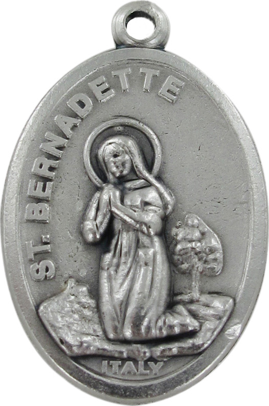 Medaglia ovale in metallo ossidato raffigurante la Madonna di Lourdes di misura 2,5 x 1,5 cm. Il prodotto è realizzato in Italia.