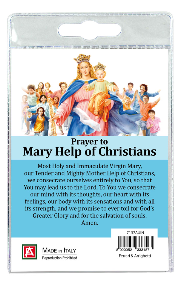 Medaglia Madonna Ausiliatrice con laccio e preghiera in inglese