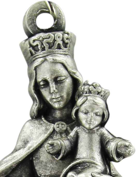 Medaglia raffigurante la Madonna Ausiliatrice in metallo ossidato.