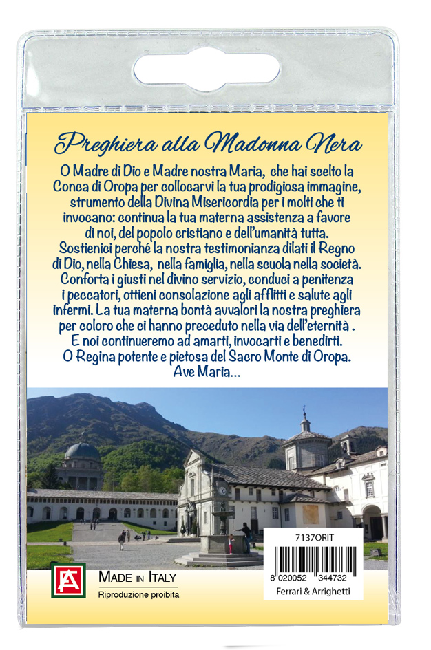 Medaglia della Madonna del Santuario di Oropa di cm 2,5 in metallo nichelato con laccio. L'immagine della Madonna è ricoperta da uno strato di resina trasparente. La medagia si presenta confezionata in un blister con all'interno un cartoncino con immagine della Madonna e con una preghiera in italiano sul retro del cartoncino stesso.
